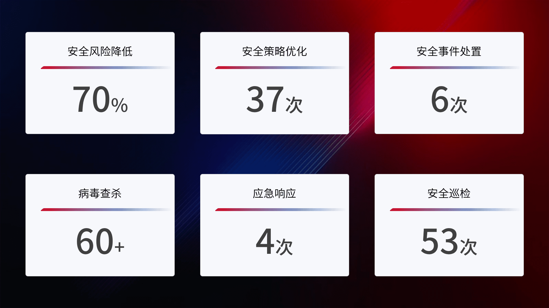 提供全面的安全事件报告体系,,包括处置报告、、周报、、、季度和年度总结,,,结合持续监控,,,帮助客户深入了解网络安全状况。。
